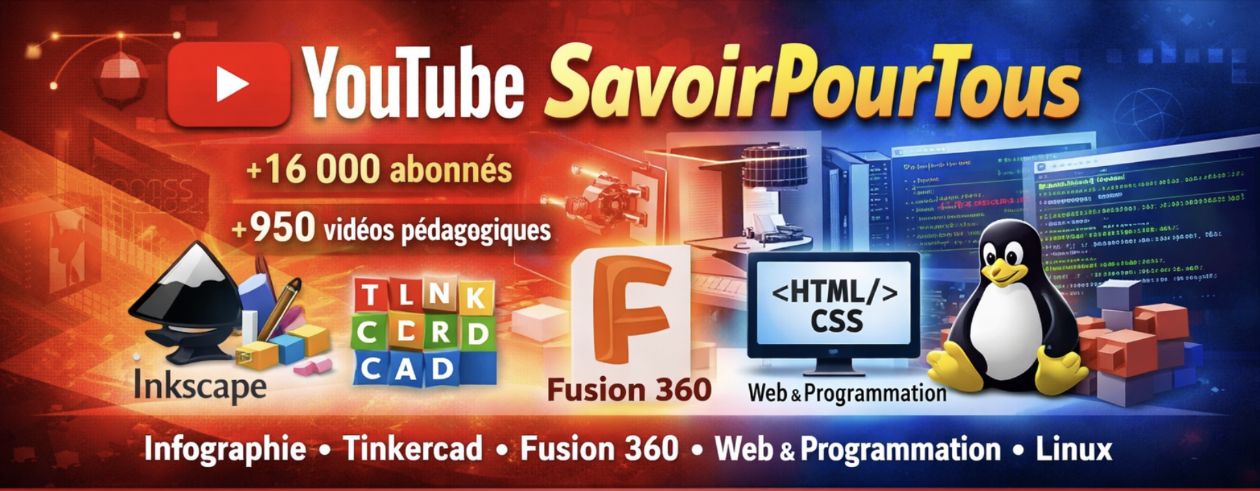 Découvrir la chaîne YouTubeComme je l'ai stipulé dans mon profil, étant passionné par l'informatique et l'infographie, vous trouverez une multitude de vidéos allant de la création d'objets 3D (Sketchup, Blender, Tinkercad) à la programmation Web (HTML5, CSS3, JavaScript) et au Script Shell sous Linux.